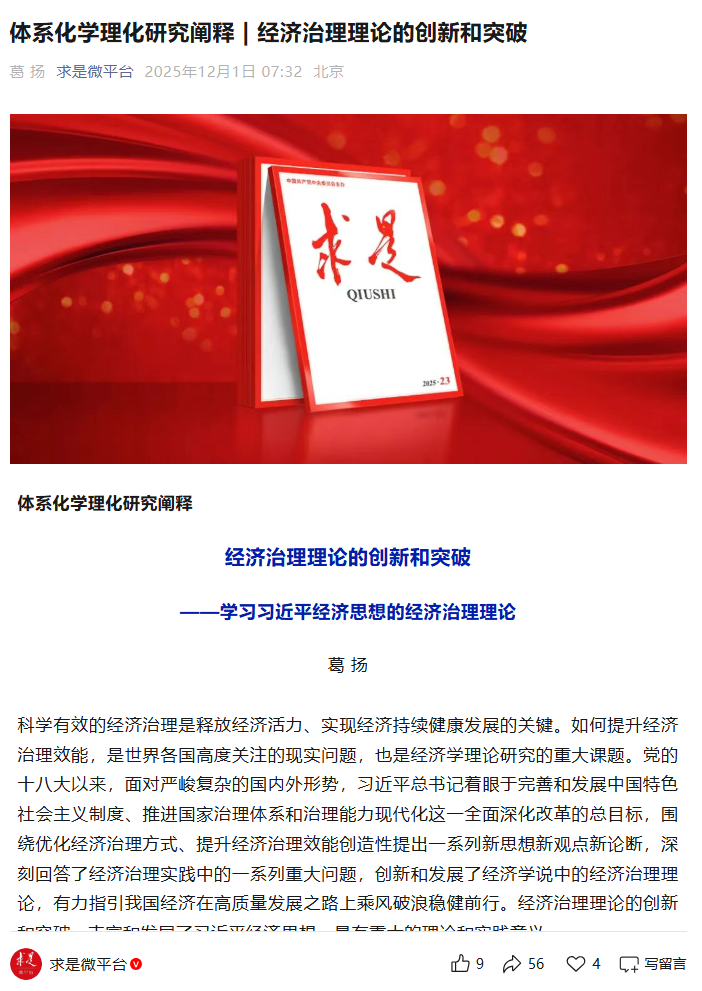 我院葛扬教授的文章《经济治理理论的创新和突破——学习习近平经济思想的经济治理理论》在《求是》2025年第23期刊登。