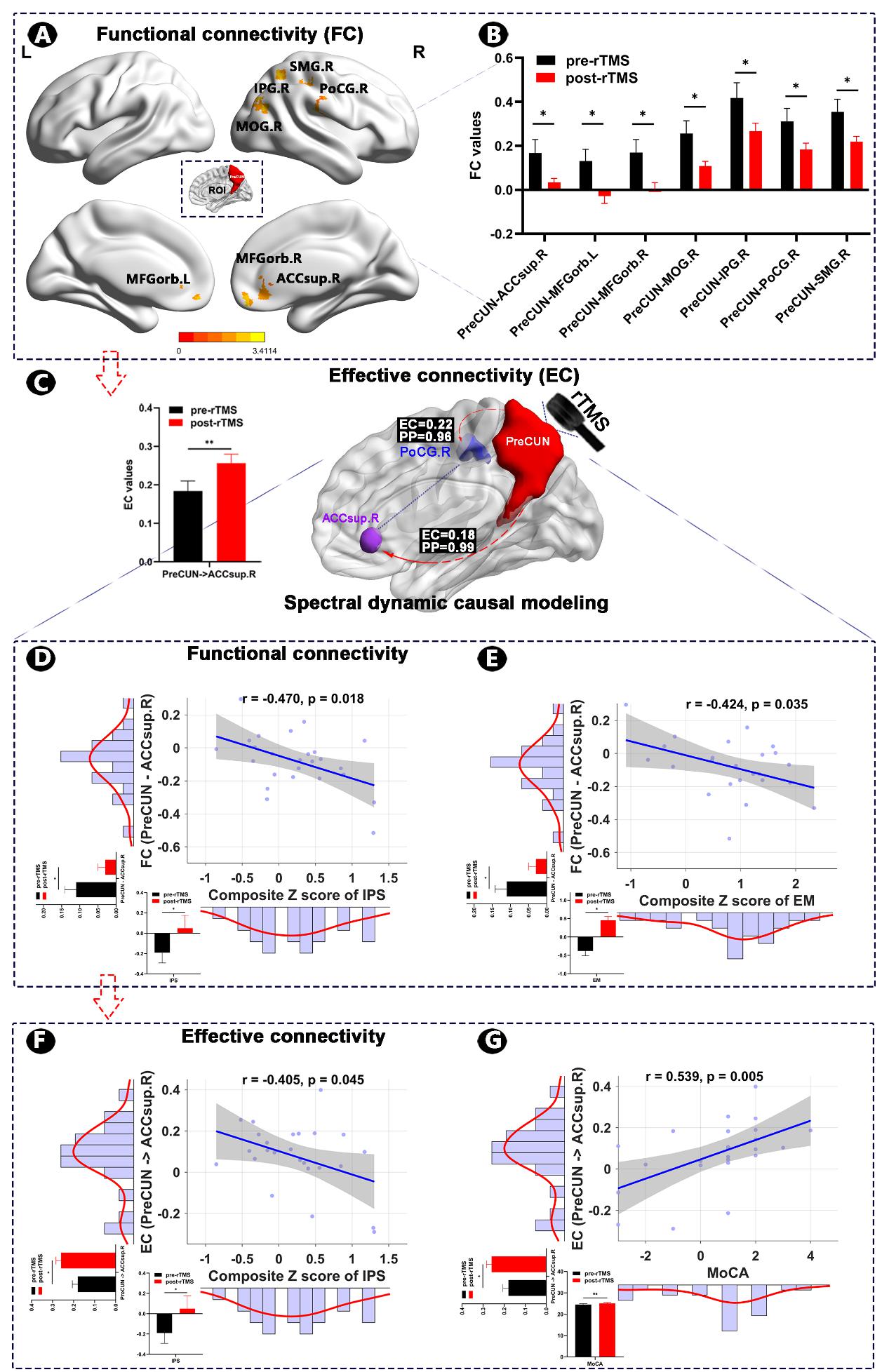 针对sACC的核心枢纽地位,团队创新提出 “靶向枢纽-修复网络-改善认知” 的因果调控逻辑,区别于传统 “泛化干预” 模式。首次在aMCI患者中验证sACC作为AD临床前期 “因果调控靶点” 的有效性。