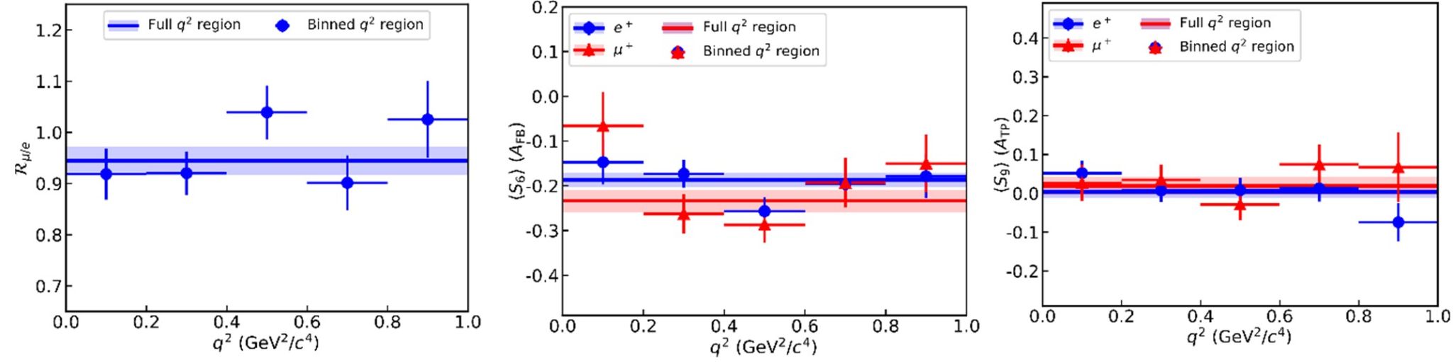图 1. 分q2区间的Rμ/e、AFB和ATP的测量结果。