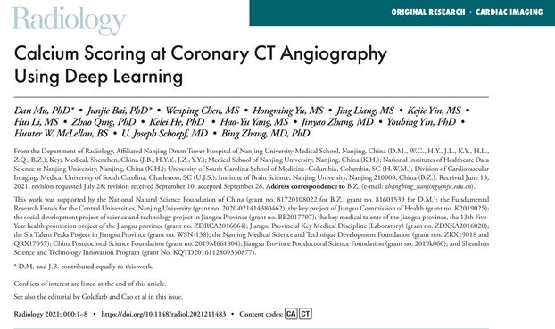 该研究以“Calcium Scoring in Coronary CT Angiography using Deep Learning”为题首登放射学顶级期刊Radiology上,医学院附属鼓楼医院医学影像科牡丹为本文第一作者,张冰教授为通讯作者。来自纽约罗斯林圣弗朗西斯医院和心脏中心的心血管影像科学家James W. Goldfarb博士和心血管影像中心主任J. Jane Cao博士同期发表述评:临床工作中可以省去增强CTA前的平扫,直接进行钙化积分,既降低辐射剂量,又提高准确率。