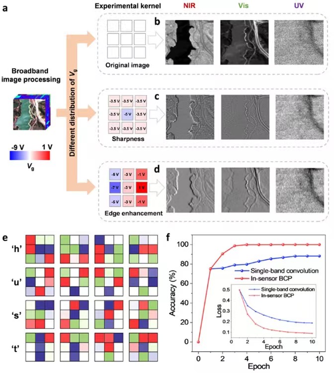 通过将异质结器件配置成不同的卷积核,合作团队展示了对包含宽光谱信息的遥感图片执行不同类型卷积滤波的处理结果(例如:遥感图像的锐化、边缘增强)(如图2a-d所示)。进一步,合作团队利用感算一体异质结传感器构建了宽光谱卷积神经网络,实现了对宽光谱图像的精确识别。对于所展示的宽光谱字母图像数据集(如图2e所示),其每个像素对应着不同波段以及不同光强的信息,基于器件的宽光谱可重构正负光响应特性,宽光谱感算一体卷积网络可以对这种混合光强及波段信息的图片同步进行探测与计算,将不同波段的图像特征信息进行关联。结合反向传播训练方法,不断进行动态训练以栅压更新,仅经过3个训练周期后,网络的识别准确率便可接近100%。与之相比,单光谱卷积器件只能探测和处理图像中特定波段的信息,为了实现宽光谱识别,需要利用多个特定的卷积核来探测不同波段的信息,然后再进行整合处理,这种拆分图像的分离波段探测处理方法不仅弱化了图像中本征特征之间的联系,增加了处理的数据量,而且使得训练速度和识别效果明显弱于宽光谱卷积处理(如图2f所示)。该工作为解决传统机器视觉系统中宽光谱信息感算分离的问题,及开发适用于复杂模式识别任务的感算一体全硬件图像识别系统提供了全新的思路。