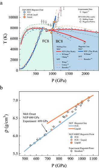 为了研究极端条件下碳的复杂行为,孙建课题组使用他们合作开发的GPUMD机器学习分子动力学方法 【Fan et al.,J. Chem. Phys.157, 114801 536 (2022)】 构建了针对高压碳的NEP(Neuro-evolution potential)机器学习力场,在GPU计算的助力下实现了接近第一性原理精度的大体系纳秒时间尺度模拟。基于该机器学习力场,他们对碳的熔化曲线,以及绝热冲击线进行计算,几乎完全复现了第一性原理计算的结果,并且与先前的理论和实验工作均吻合的很好。