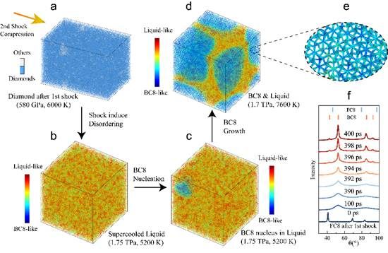 图2: 双冲击条件下金刚石向BC8碳的相变过程。(a-d) 相变过程中的结构示意图,根据局域环境相似度进行着色。(e) BC8碳的特征结构示意图。(f) X射线衍射图谱随时间的演化。