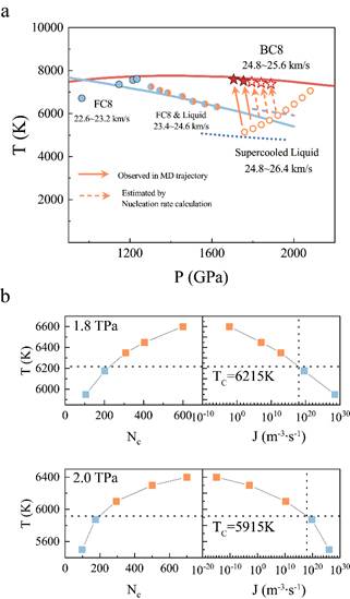图3:(a)第二次冲击压缩中,不同冲击速度下系统的所处的状态。(b) 经典成核理论框架下计算得到的临界核大小与成核率。