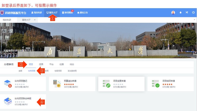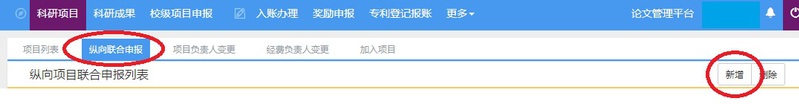 Step 2(线上). 收到回复邮件确认合同没有问题后,由我校项目负责人在南大科研平台(ky.nju.edu.cn)中新增“纵向项目联合申报”(请留意不是“纵向项目登记”),登记相关信息并提交;