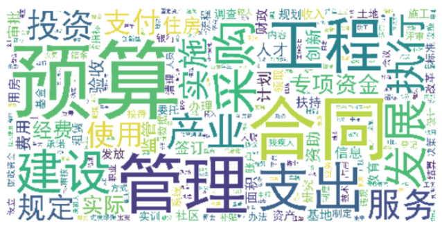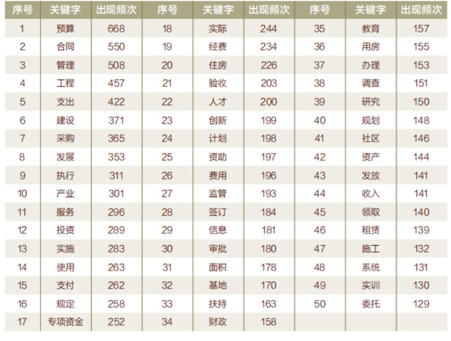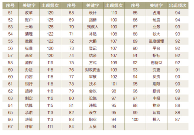 根据审计查出问题事实分类。考虑以审计整改台账为基础,借助大数据手段,抓取审计查出问题高频词汇,并对其进行筛选、分析和处理,从而提炼出审计查出问题分类。第一步:采用NLP分词技术对某审计局2019-2020审计年度查出问题整改台账中1157个问题的“问题事实”进行分析,并通过P yplot可视化技术生成高频词词云(如图1)。第二步:取前50个高频词汇(如表1),剔除干扰项并进行同类合并,如“工程”“建设”“验收”等词可合并为工程类;“预算”“支出”“采购”等词可合并为资金管理类;“住房”“租赁 ”等词可合并为资产管理类。至此,初步分为工程、资金管理、资产管理等3个大类。第三步:再取第51-100个高频词汇(如表2)进行查漏补缺,并加入自然资源、政策制定和执行等2个大 类。第四步:根据实际实施审计项目情况,将自然资源类扩充为自然资源和生态保护类,再加入其他类进行兜底,得到工程、资金管理、资产管理、自然资源和生态保护、政策制定和执行、其他等6个大类。第五步:将1157个问题按照6个大类分类后进行分析,通过合并同一性质的问题形成细项问题分类。最终形成如下问题分类,共包含6个大类100个问题。