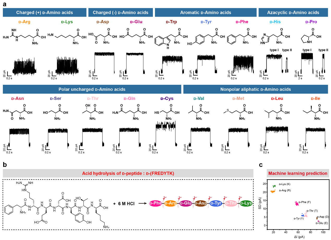 近日,我室黄硕教授课题组基于原创开发的镍离子-次氮基三乙酸(Ni-NTA)修饰的耻垢分枝杆菌膜蛋白A纳米孔(MspA-NTA-Ni),首次实现了全部手性氨基酸的同时分辨,是世界上第一个能够完全分辨所有39种氨基酸对映体的纳米孔。该传感器可以同时识别所有19种D-氨基酸和无手性的甘氨酸(图1),准确率达到99.5%。该策略被进一步用于D-肽的氨基酸组成分析,证明了该策略用于鉴定D-肽组成的能力。