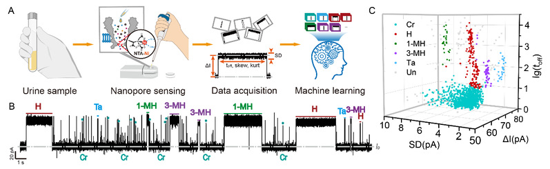 针对这一技术瓶颈,我室黄硕教授课题组创新性地开发了一种基于工程化纳米孔(MspA-NTA-Ni)的便携检测平台。该技术通过将单镍离子功能化的Mycobacterium smegmatis porin A(MspA)纳米孔与机器学习算法结合,突破传统检测方法的限制,仅需一滴尿液,无需复杂样本前处理,即可在几分钟内完成肌酐、牛磺酸、组氨酸、1-甲基组氨酸、3-甲基组氨酸、次黄嘌呤等六种关键代谢物的无标记、同步检测,准确率高达98.5%。平台通过机器学习算法自动识别代谢物特征信号,可实现尿液代谢物自动化分析(图1)。
