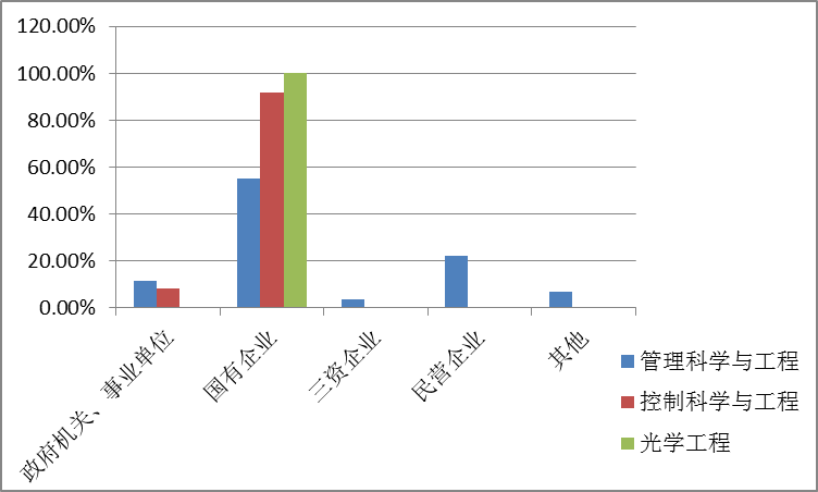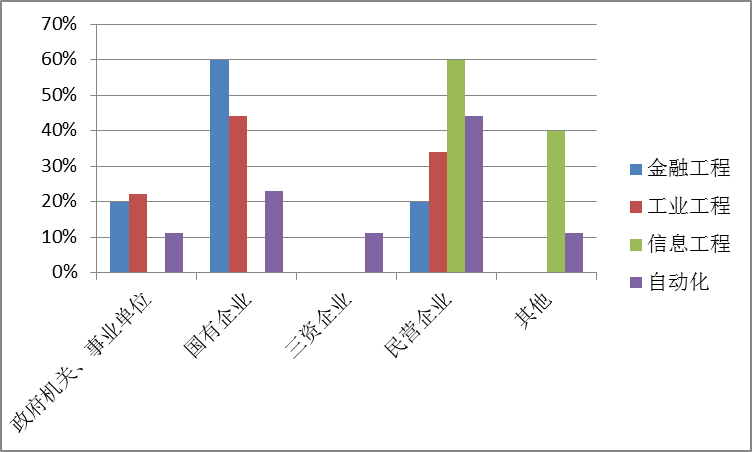 该图表明,本科生和硕士就业所在地区分布差别不大。东部发达地区仍然是学院毕业生首选的就业地区,在所有毕业生中,就业地区属于东部的高达90%左右,而选择在中西部地区就业学生比重却不到12%。分析造成这一现象的原因,首先是我国经济发展的区域不平衡,东部地区的就业机会和发展前景要优于中西部地区,其次,学校所在地和大部分生源所在地属于东部地区,毕业生也更倾向于就近在东部地区就业。