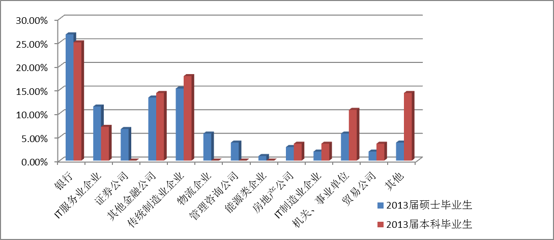 下表给出的是2013届本科生和硕士工作单位的行业分类情况。