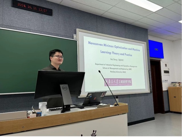Dr. Zhang Siqi from Department of Industrial Engineering and Operations Management gave a lecture entitled ‘Algorithm Design and Analysis in Large-Scale Nonconvex Minimax Optimization’. The presentation introduced the recent progress of algorithm design and analysis in large-scale Nonconvex Minimax Optimization. In the context of artificial intelligence applications, the presentation introduces how to design efficient algorithms in Large-Scale Nonconvex Minimax Optimization, analyses the convergence performance of the relevant algorithms, and further introduces the theory of generalization performance analysis of these optimization algorithms, and finally introduces the application of this type of problems in distributed learning, proposes the relevant communication acceleration algorithms, and gives theoretical analyses and experimental validation.