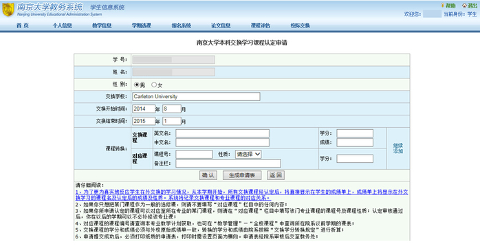 (注:本科生的《交换课程学分认定申请表》须学生登录教务处的交换生管理系统,自行填写相关成绩并确定后,点击“生成申请表”,系统可自动生成学分认定申请表,如下图所示。)或研究生院规定的