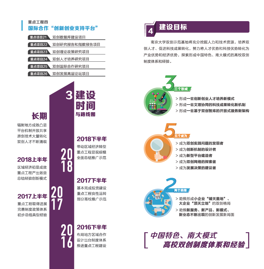 南京大学作为2016年首批入选的国家双创示范基地之一,面向国家重大产业需求,突出问题导向,结合江苏省和南京市的区域特点,依托南京大学的优势与特色,积极建设四个相互支持、各有侧重、优势集中的运行平台——产学融合“校园众创实训平台”、校地共建“科技成果转化平台”、校企协同“文化创意产业平台”、国际合作“创新创业支持平台”,强化政策与制度创新,服务国家创新驱动战略和地方经济发展。