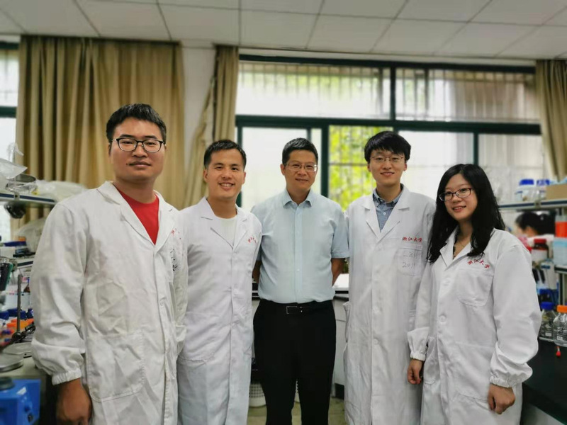 金彪(左二)与博士生导师和课题组在浙江大学化学系实验室