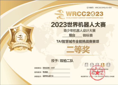 2023世界机器人大赛锦标赛(烟台)获奖证书