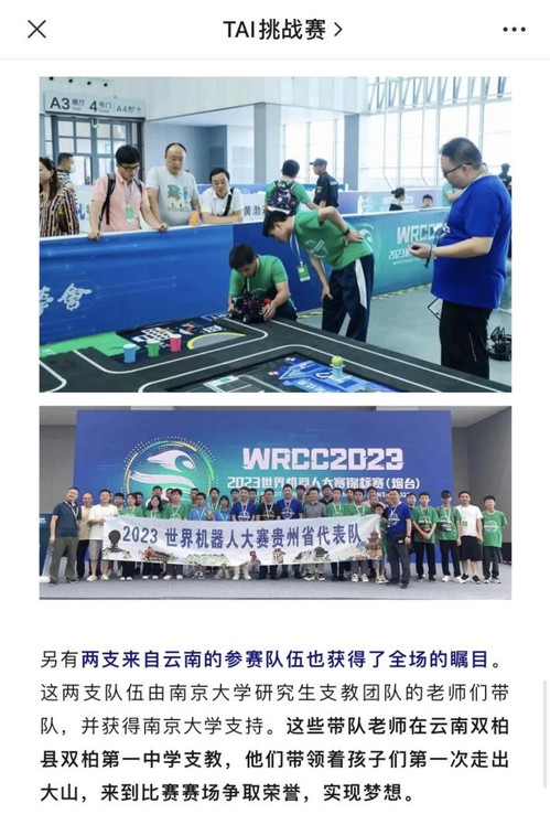 2023年6月,在2023世界机器人大赛锦标赛(烟台)中,南京大学研究生支教团指导并带领两支双柏一中代表队参赛。小组赛中,他们从全国高中组总计17支入围队伍中脱颖而出,分获第4名(谢孟良、罗丹)和第6名(赵映雄、赵存宝)。决赛中他们稳定发挥,最终斩获“TAI智慧城市全能挑战赛”赛项二等奖。