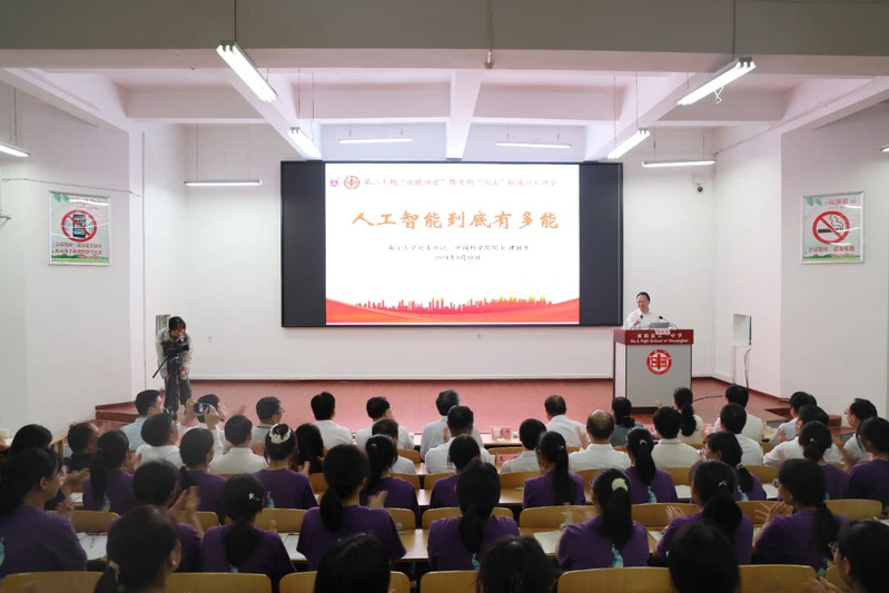 18日上午,谭书记在双柏县第一中学礼堂作题为“人工智能到底有多能”的主题讲座。讲座中,谭书记不仅深入浅出地介绍了人工智能的基本概念,更结合时代背景和生动案例,详细解析了该领域的发展现状,还与大家分享了他对人工智能未来趋势的独到见解,为在场师生开拓了新视野、拓宽了新思路。本次讲座是第二十期“南雍讲堂”暨首期“向南”AI通识大课堂。未来,在校团委的指导下,研支团将积极联动南京大学本科生“人工智能通识核心课”教学体系,以本场讲座为契机和起点,在双柏县持续推出“向南”AI+通识大课堂,并逐步探索、研发形成面向中小学各学段、各年级的可推广、可复制的人工智能通识课程体系,力争宽领域、多角度、全方位培养双柏学子的人工智能素养。