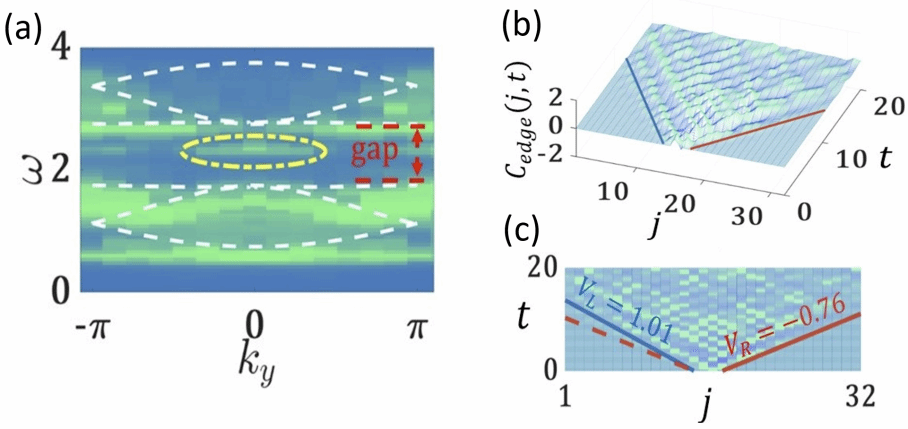 图2. (a)含时密度矩阵重整化群计算的磁振子能谱;(b) 边界上的自旋关联函数;(c) 左行和右行自旋传播模式速度不同。