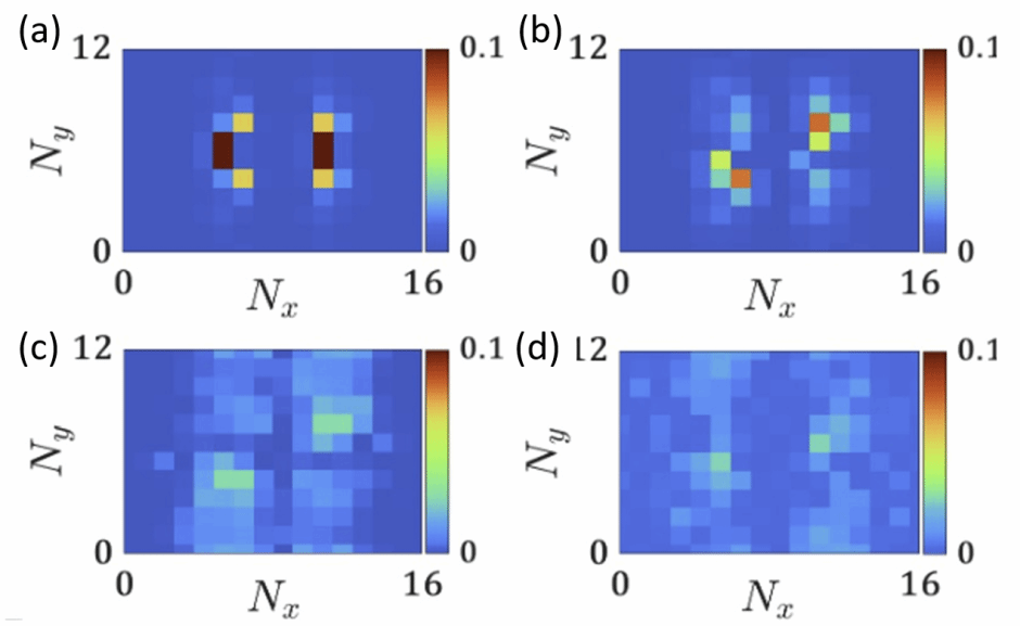 图4. 在周期含时人工规范场驱动下的自旋子动力学演化行为,从(a)到(d)时间逐渐增加,自旋子逐渐退局域化。