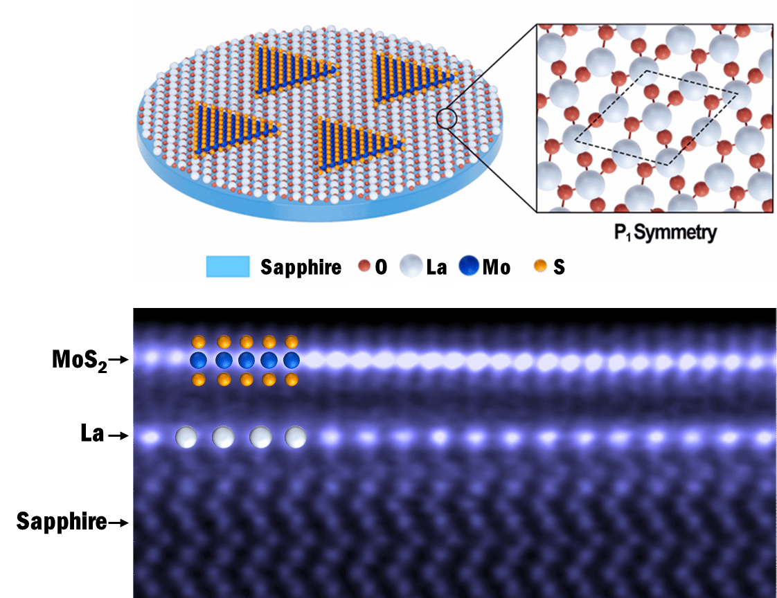 蓝宝石是理想的产业化外延衬底,但由于高对称性,二维半导体存在多个等价方向,拼接时容易产生多晶。该研究的革命性突破在于团队开发的稀土原子表面修饰技术——在蓝宝石表面构建镧单原子层。虽然只有一个原子层的厚度,但是却打破蓝宝石表面固有的对称性,让二维半导体成核锁定在同一个方向上,确保了晶畴的单向排列进而长成单晶。该技术解决了长久以来二维半导体制备存在的重复性、稳定性以及工艺窗口狭窄等局限,适用于多种材料和多种工艺条件。正是这一创新,将普通的蓝宝石衬底“点石成晶”,从根本上解决了二维半导体单晶规模化制备的难题。