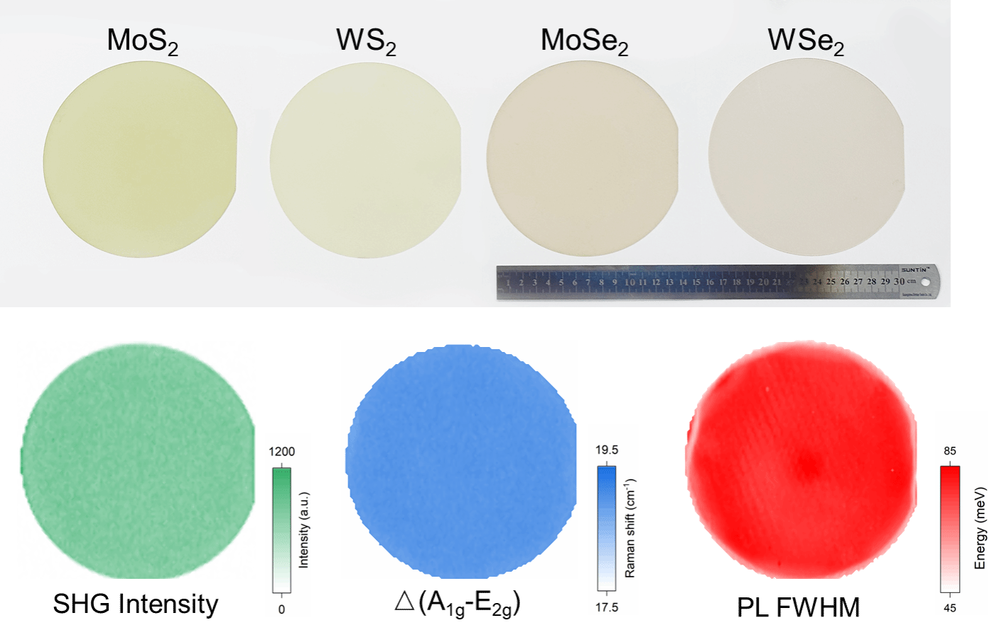 基于量产化的MOCVD技术和镧表面修饰的蓝宝石衬底,团队一举实现了6英寸二硫化钼(MoS2)、二硫化钨(WS2)、二硒化钨(WSe2)和二硒化钼(MoSe2)等二维半导体单晶的普适制备。多种光谱和电学表征技术证实了优异的材料质量和均一性,MoS2和WSe2的平均迁移率分别高达110 cm2·V-1·s-1和131 cm2·V-1·s-1,单晶尺寸、器件性能同步刷新记录,实现大尺寸与高质量兼得。