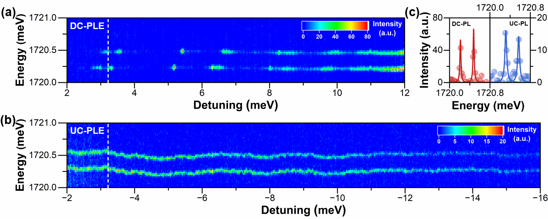 图1:单个CsPbI3纳米晶在4 K低温下的2D(a)下转换荧光激发谱 (DC-PLE)和(b)上转换荧光激发谱 (UC-PLE)图像。(c)从(a)和(b)白色虚线位置提取的下转换荧光谱(DC-PL)和上转换荧光谱(UC-PL)。