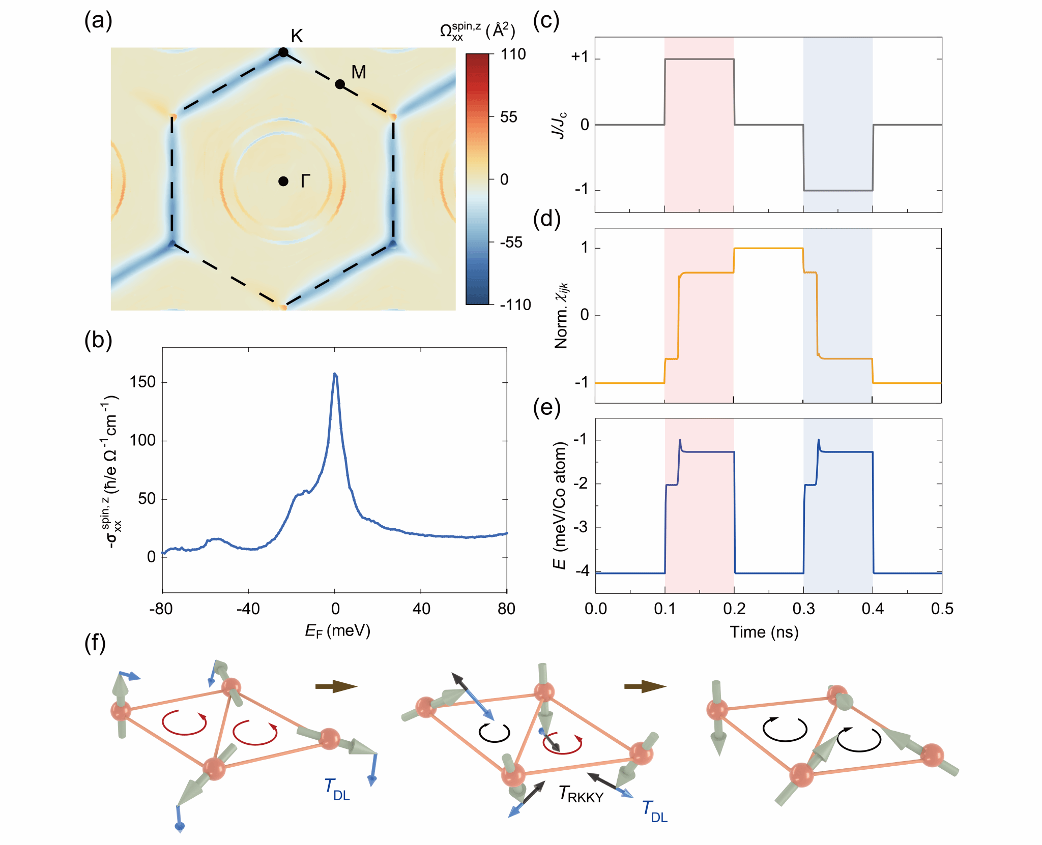 图4. (a)计算得到的CoTa3S6中动量分辨的自旋贝里曲率。颜色表示自旋贝里曲率的大小。(b)计算得到的自旋电导率随费米能级变化的函数,表明在杂化能带附近显著增强。(c)原子尺度自旋动力学模拟中的输入电流脉冲。(d)标量自旋手性的时间演化。(e)每个Co原子的总能量随时间的演化。(f)原子尺度手性反铁磁序翻转机制的示意图。
