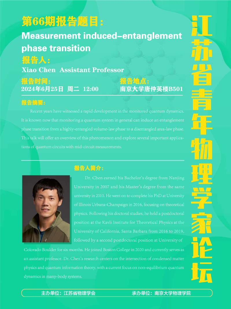 6月25日 江苏省青年物理学家论坛 Boston College Assistant Professor Xiao Chen 学术报告:Measurement induced-entanglement phase transition
