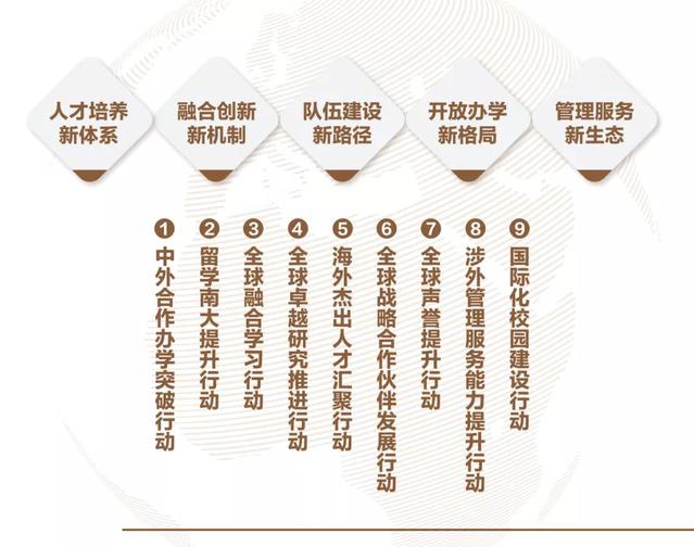 全球战略提出五大建设路径与任务,九项行动计划与举措,从人才培养、机制创新、队伍建设、开放办学、管理服务五大方面着手,构建全方位、高层次、多元化全球开放合作体系。