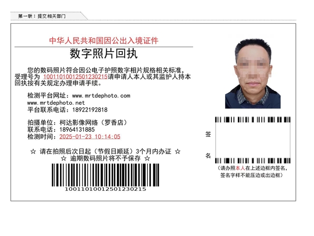 (2)办理因公护照无需纸质照片,需通过照相馆(如大唐)拍摄白底专用证件照或自拍后将照片上传至网站https://www.idphotoplus.com/pages/licence进行缴费检测后获取20位照片回执受理号。
